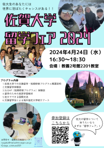 「留学フェア」は年に1回開催するイベントで佐賀大学の留学制度や留学支援、国際交流などについて説明や体験談発表などを行うものです。
