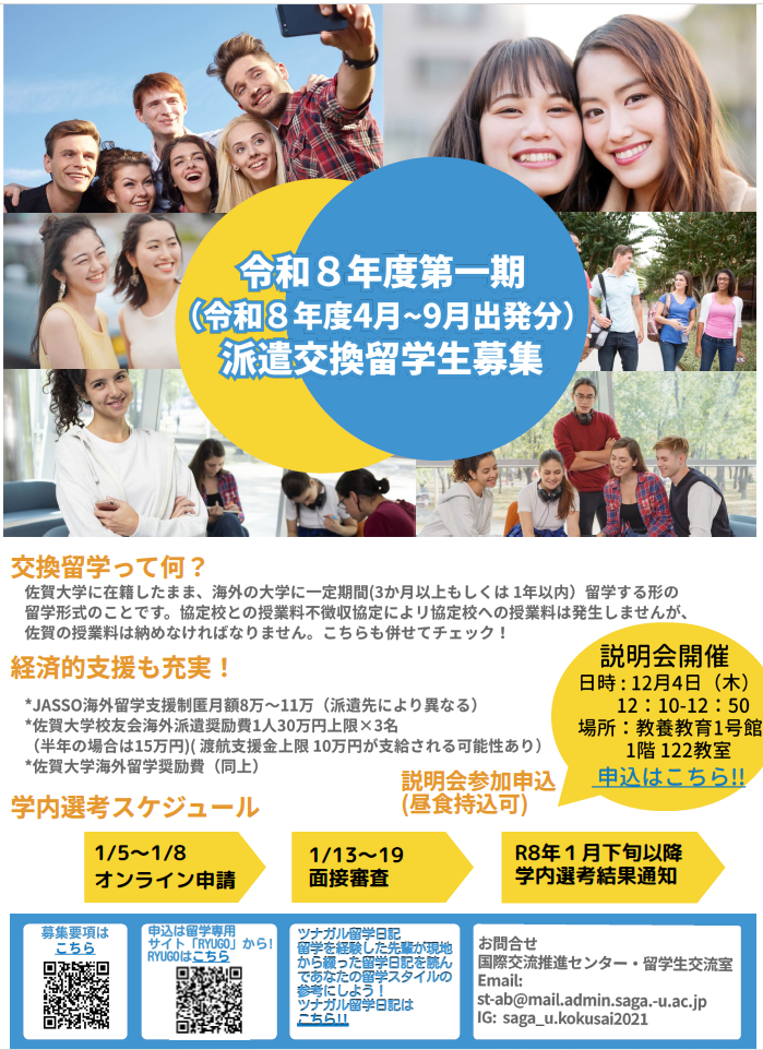 令和8年度第一期派遣交換留学生募集のお知らせ(令和8年度4月~9月出発分)