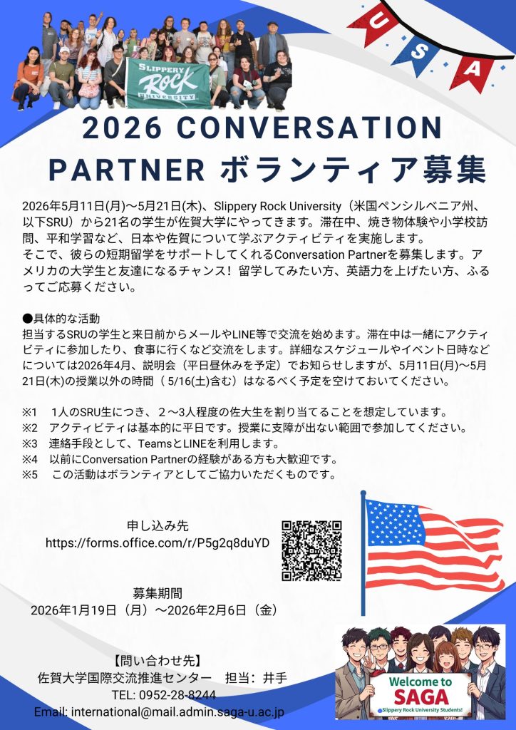 アメリカのスリッパリーロック大学短期留学生受け入れに伴い、佐賀大学生のComversation Partnerを募集します。詳細については添付のチラシをご覧ください。