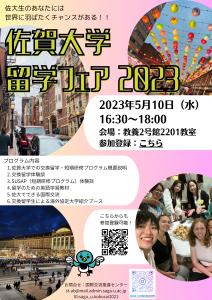 「留学フェア」は毎年1回開催される佐賀大学での「留学」や「海外研修短期プログラム」「国際交流」について紹介をする説明会です。