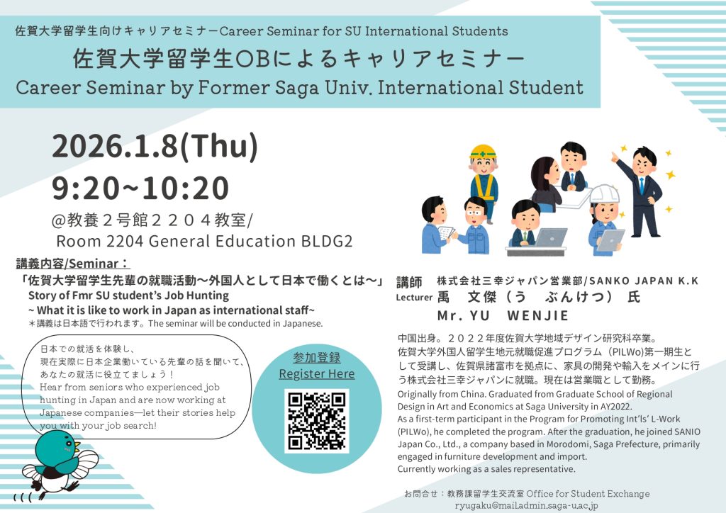 He will share his experiences as an international student at Saga University, including job hunting in Japan and working in Japan as a foreign professional.