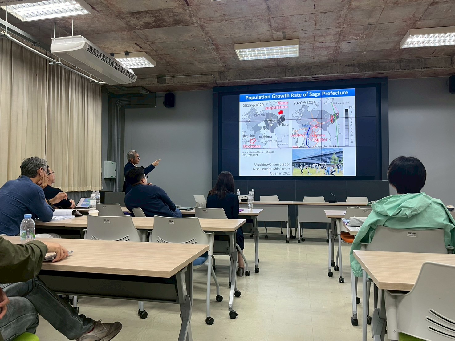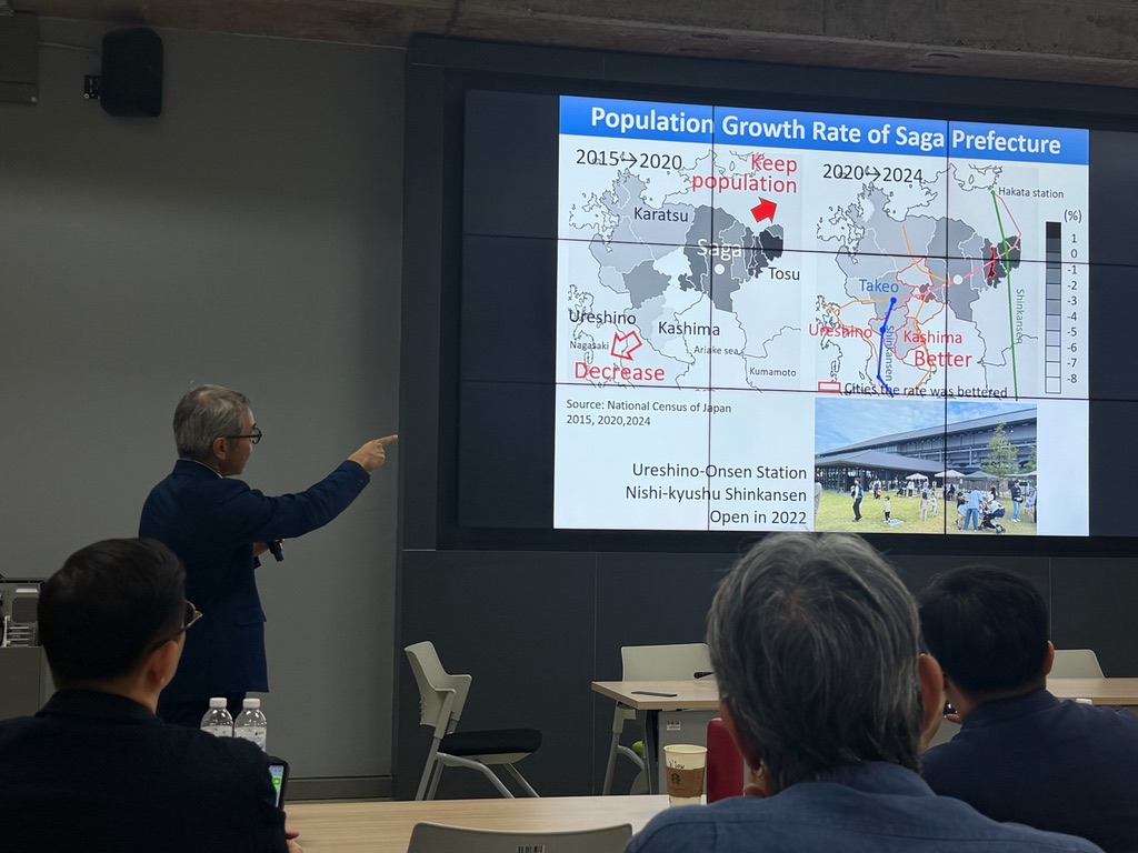 Professor Mishima also delivered a lecture titled “Trends in Population Decline in Japan and Saga Prefecture.” He explained that although Saga Prefecture is relatively small in population, it ranked 19th nationwide in terms of population decline rate as of 2024, showing comparatively strong performance. He also demonstrated that the population decline rate in Kashima and Ureshino improved from −6 to −8% in 2000 to −3 to −5% in 2024, highlighting the effectiveness of community-led town development and placemaking efforts such as station plaza improvements.