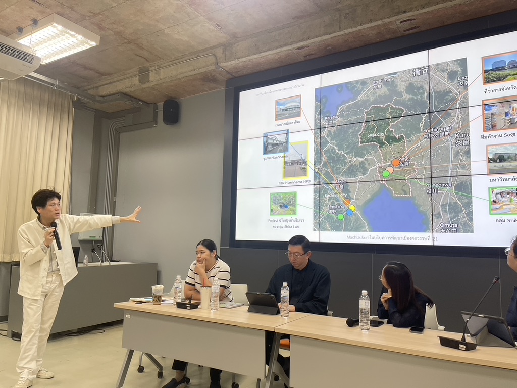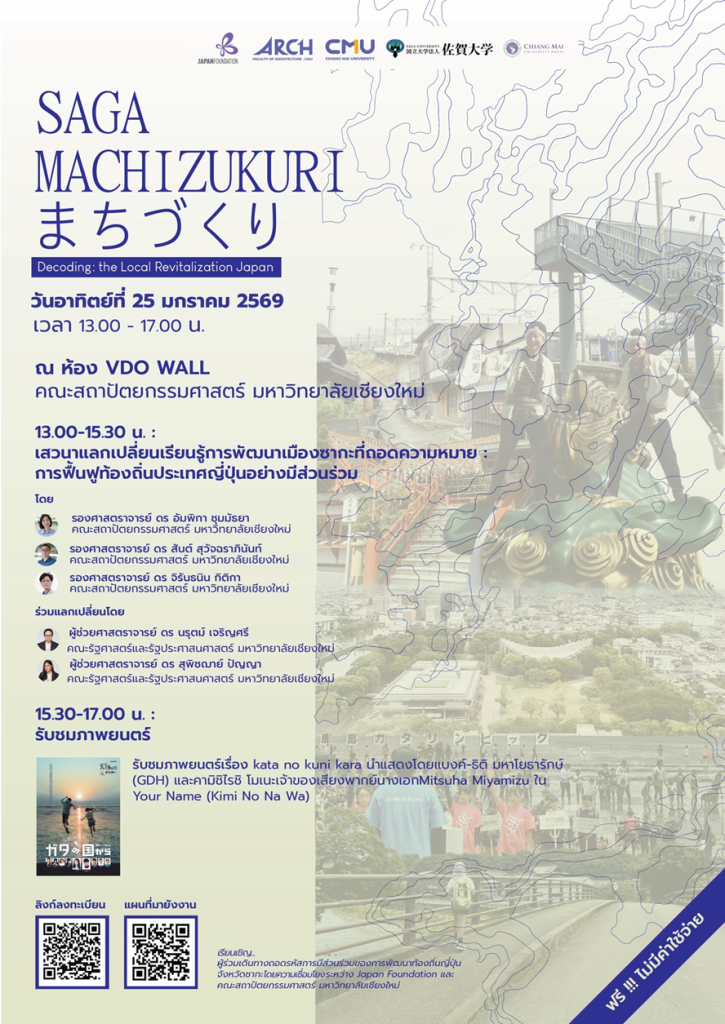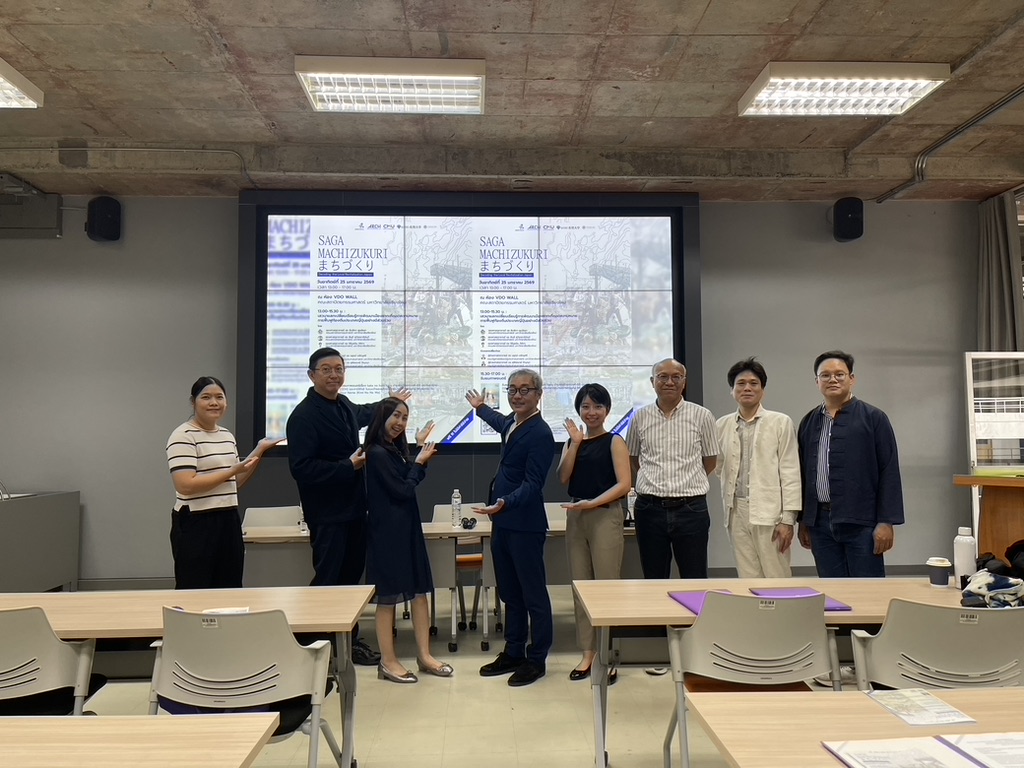 On January 25, 2026, the “Saga Machizukuri” seminar was held at the Faculty of Architecture, Chiang Mai University, the lead institution of our university’s Strategic Partnership Project (Thailand). The research project was selected for the Japan Foundation’s international grant program and was made possible through the long-standing collaboration between Saga University and Chiang Mai University, including suggestions by Professor Nobuo Mishima of the Department of Civil and Environmental Engineering in preparing the grant proposal and his introduction of interviewees in Saga Prefecture.
