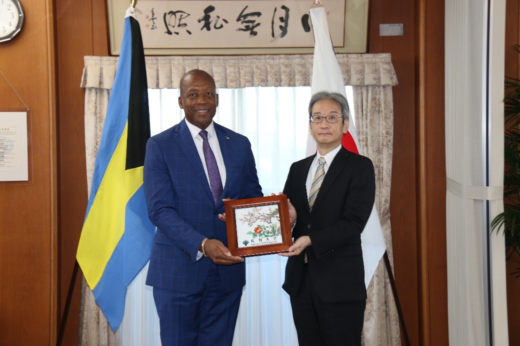 Director Ikegami (center left) and Assistant Professor Yasunaga (left) with the Bahamas Minister and his delegation